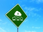 Safety concept: Cloud Network on green road (highway) sign, clear blue sky background, 3d render