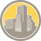 Illustration of urban commercial buildings skyscraper set inside circle on isolated background done in retro style.