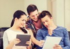 education, high school, teamwork and people concept - group of smiling students with tablet pc computer and notebook sitting in lecture hall