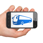 Travel concept: Hand Holding Smartphone with blue Bus icon on display, Tag Cloud background