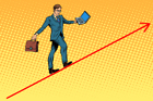 Businessman acrobat walking the wire graphics pop art retro style. The business concept of the circus. Balance in business