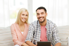 love, family, technology, internet and happiness concept - smiling happy couple with tablet pc computer at home