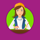 Journalist sitting at the table and writing in notebook with pencil. Journalist writing notes with pencil. Journalist at work. Vector flat design illustration in the circle isolated on background.