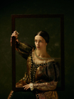 Portrait of a girl wearing a princess or countess dress over dark studio. portrait through picture frame