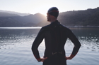 triathlon athlete start swimming training splashing water while running and jumping