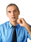 The man in a dark blue shirt and a black necktie